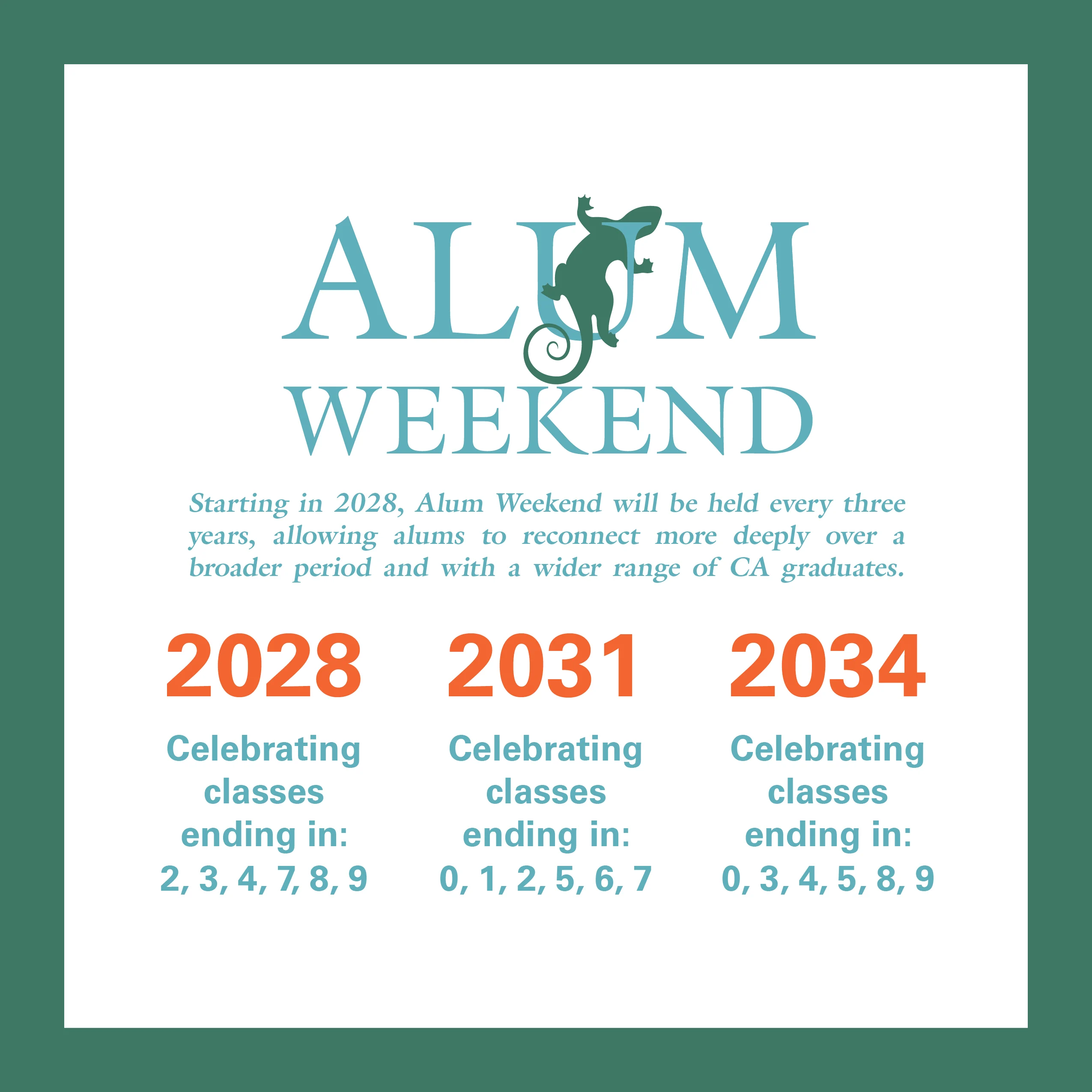 Classes will find the frequency that they reunion to be not too different from a traditional 5-year reunion model. Each class can expect to be invited back to campus every 3 years, with an occasional 6 year intermission. As always, all alums will be invited to attend every Alum Weekend.