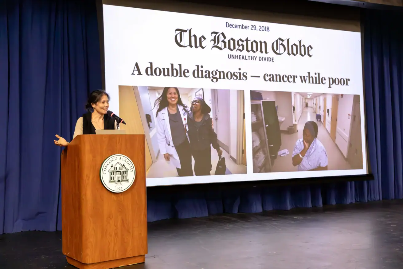 When breast oncologist Naomi Ko ’91, P’21 ’26 visited Concord Academy on February 6, 2026, she spoke passionately about what she investigates: “Why do Black and brown women die of breast cancer at much higher rates than white women?” In a talk by turns historically informed and deeply personal, she offered the professional perspectives of both a researcher and a practicing clinician, as well as her own story of losing her grandmother to breast cancer.