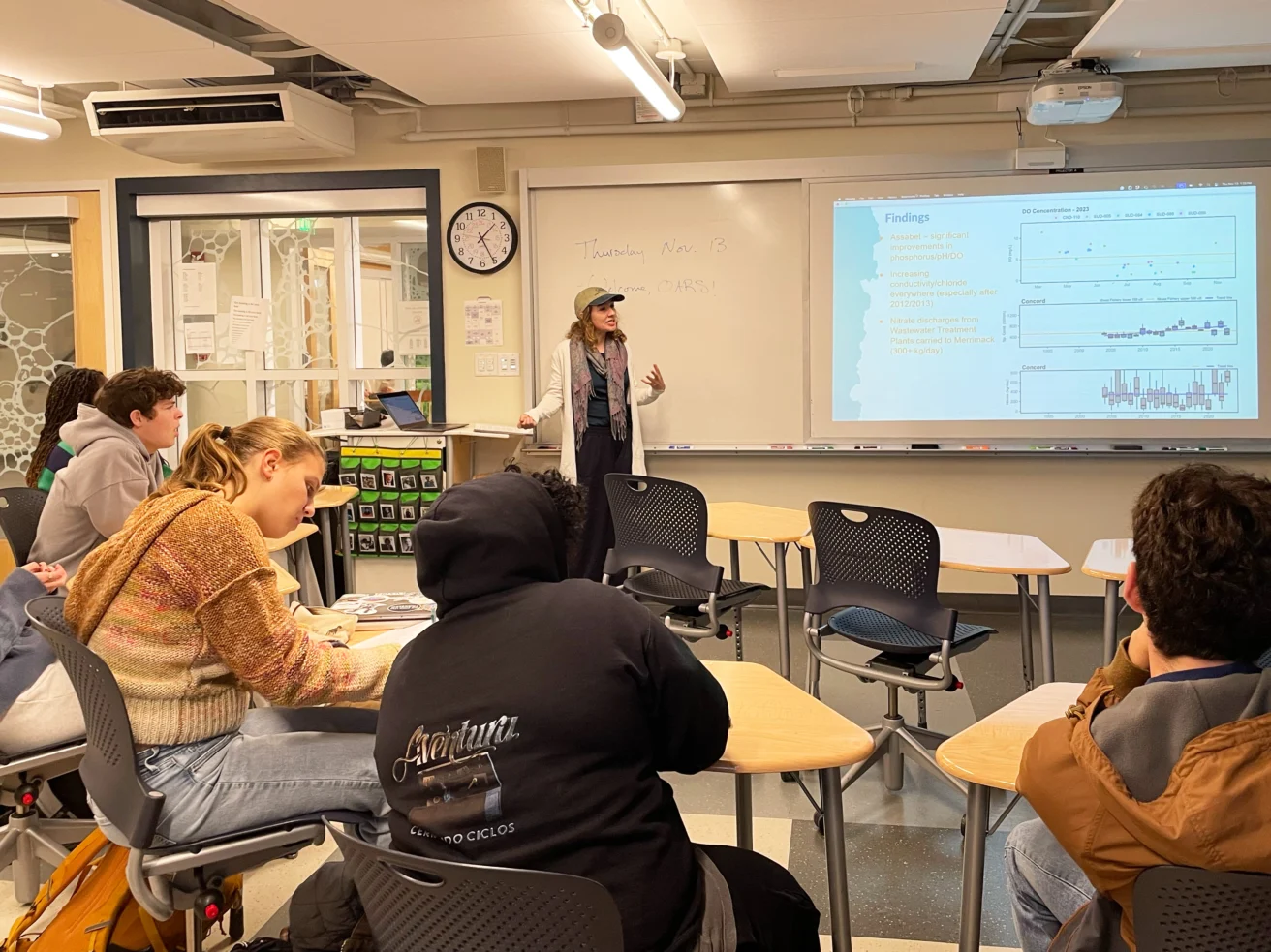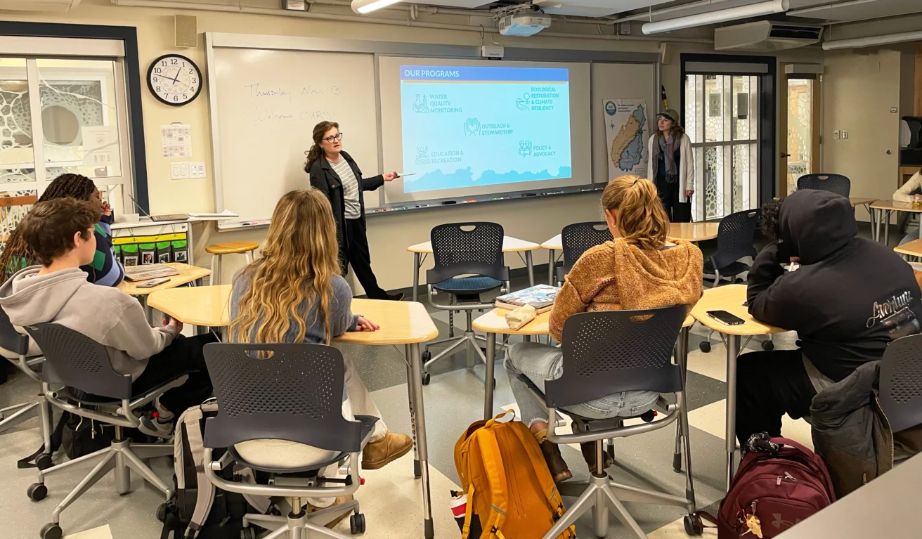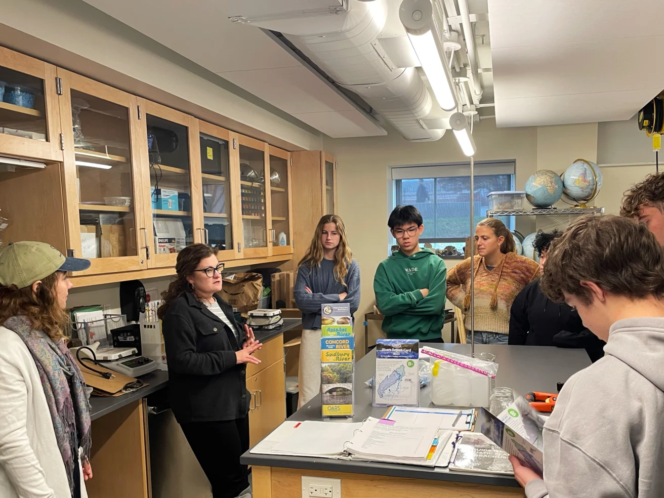 On November 13, two staff members from OARS, a local nonprofit watershed organization, visited both sections of science teacher and environmental sustainability lead Chris Labosier’s Water Resources course at Concord Academy. In this upper-level environmental science elective, students have been exploring waterways through ecological, historical, social, political, and economic lenses. They’ve learned about the physical processes that shape streamflow and landscape formation, the chemical and biological factors that influence water quality, and the influence of climate change on the hydrologic cycle and ecosystems. Getting to talk with professionals who steward the Sudbury, Assabet, and Concord rivers and their tributaries helped Labosier’s classes understand the interconnectedness of human development and watershed health in practical terms—right here in CA’s backyard.